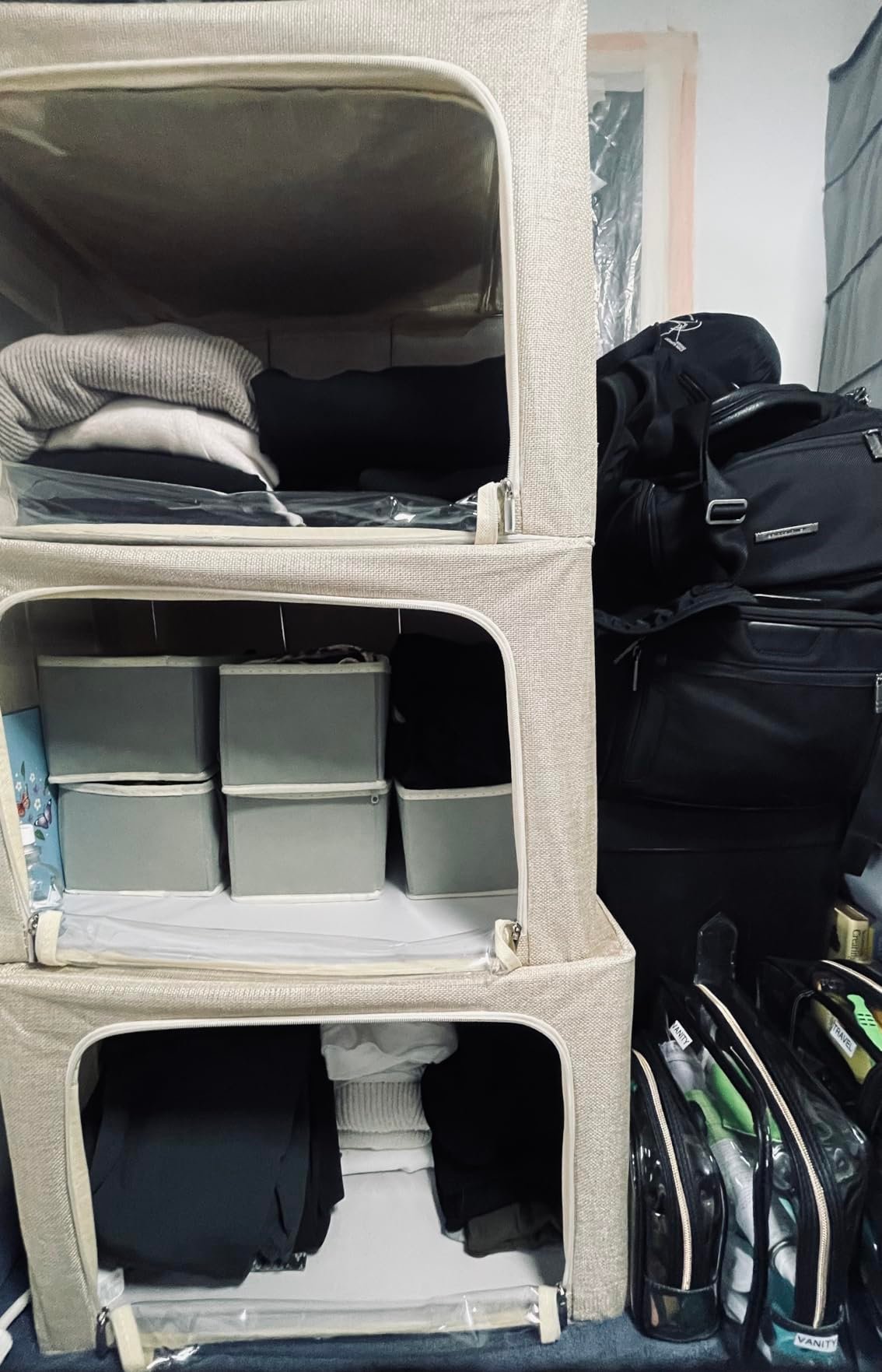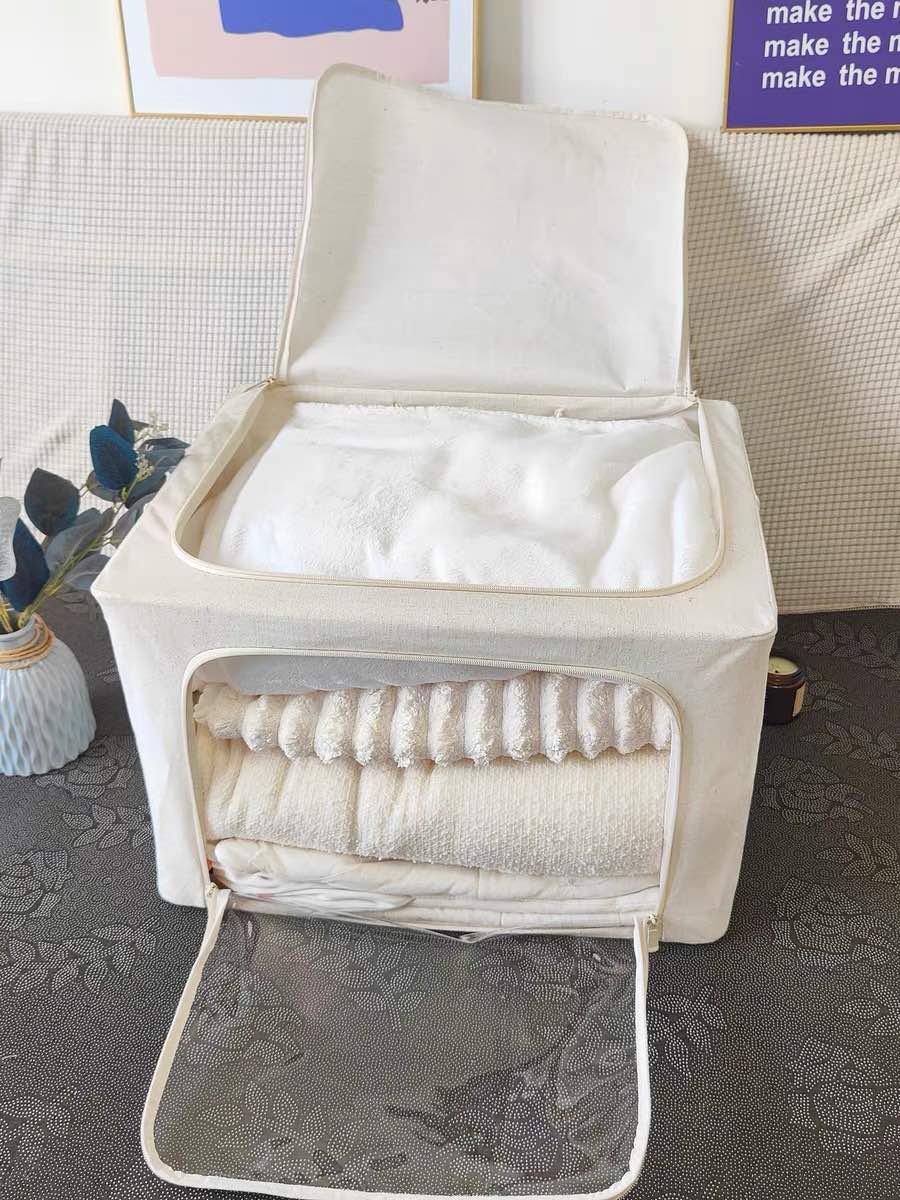 “Perfect size for extra blankets and hoodies. I stacked two on my closet shelf and they stay sturdy. Way better than plastic bins.”